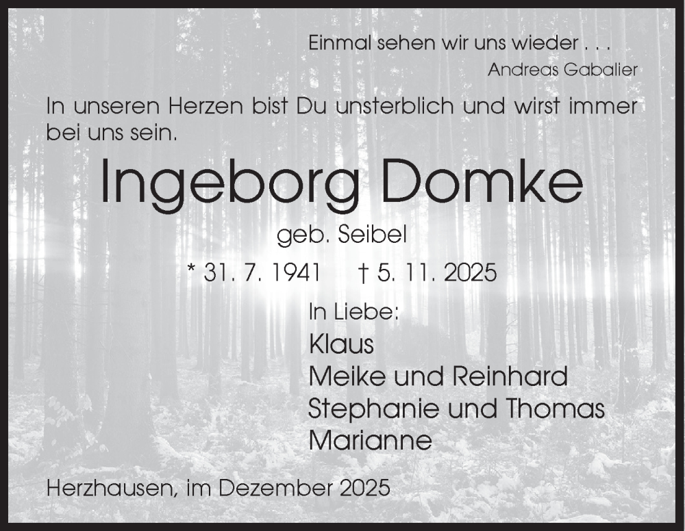 Hier finden Sie alle Traueranzeigen aus der Zeitung, die bisher für Ingeborg Domke erschienen sind. Weitere Traueranzeigen, die in der Zeitung erscheinen, werden hier ebenfalls aufgelistet
