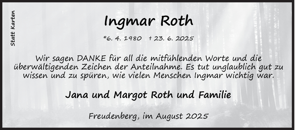 Hier finden Sie alle Traueranzeigen aus der Zeitung, die bisher für Ingmar Roth erschienen sind. Weitere Traueranzeigen, die in der Zeitung erscheinen, werden hier ebenfalls aufgelistet
