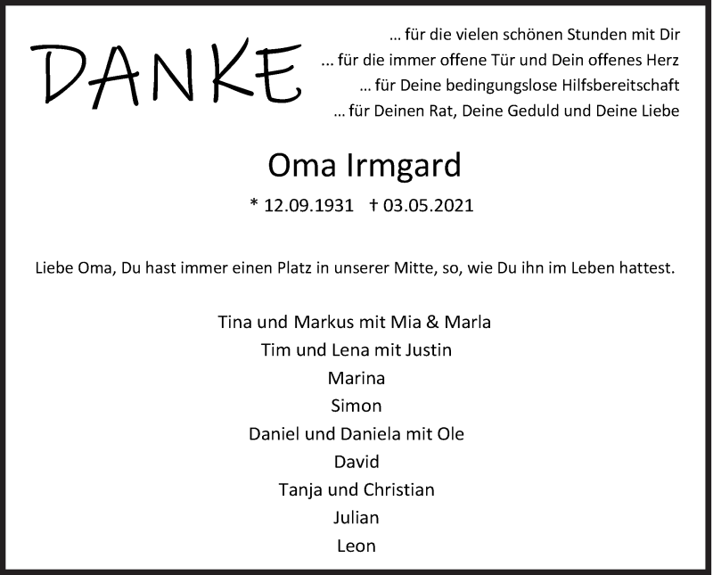 Hier finden Sie alle Traueranzeigen aus der Zeitung, die bisher für Irmgard erschienen sind. Weitere Traueranzeigen, die in der Zeitung erscheinen, werden hier ebenfalls aufgelistet