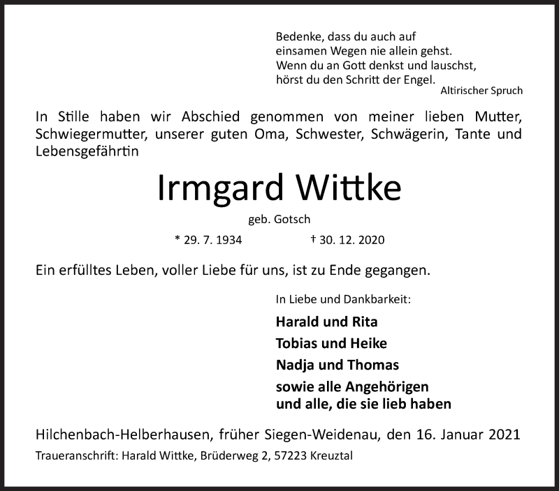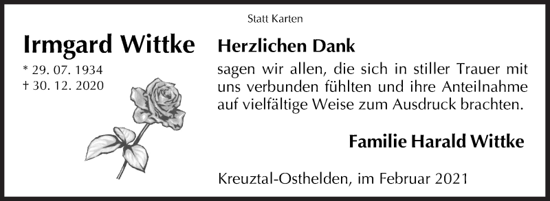 Hier finden Sie alle Traueranzeigen aus der Zeitung, die bisher für Irmgard Wittke erschienen sind. Weitere Traueranzeigen, die in der Zeitung erscheinen, werden hier ebenfalls aufgelistet