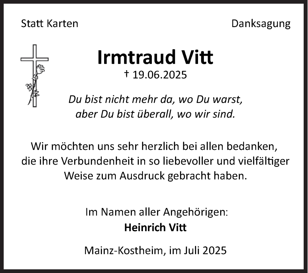 Hier finden Sie alle Traueranzeigen aus der Zeitung, die bisher für Irmtraud Vitt erschienen sind. Weitere Traueranzeigen, die in der Zeitung erscheinen, werden hier ebenfalls aufgelistet