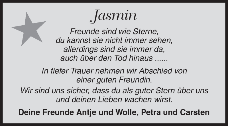 Hier finden Sie alle Traueranzeigen aus der Zeitung, die bisher für Jasmin erschienen sind. Weitere Traueranzeigen, die in der Zeitung erscheinen, werden hier ebenfalls aufgelistet