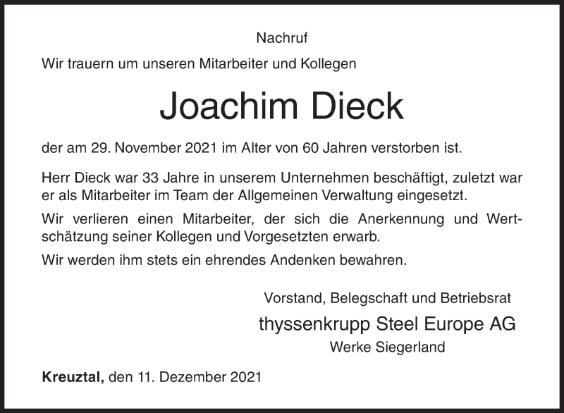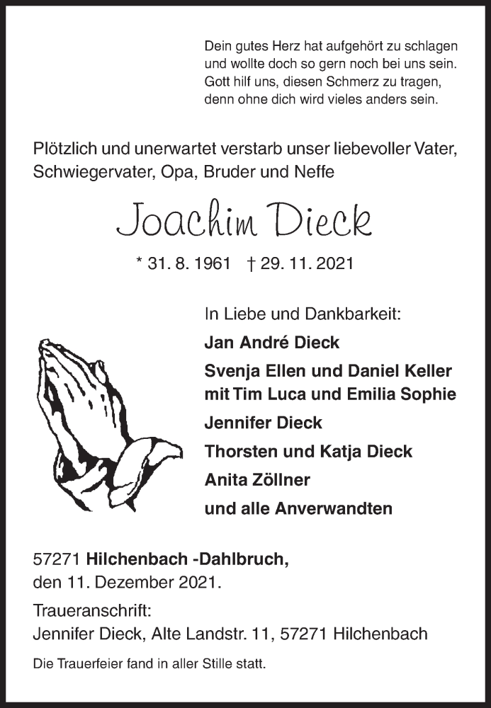 Hier finden Sie alle Traueranzeigen aus der Zeitung, die bisher für Joachim Dieck erschienen sind. Weitere Traueranzeigen, die in der Zeitung erscheinen, werden hier ebenfalls aufgelistet