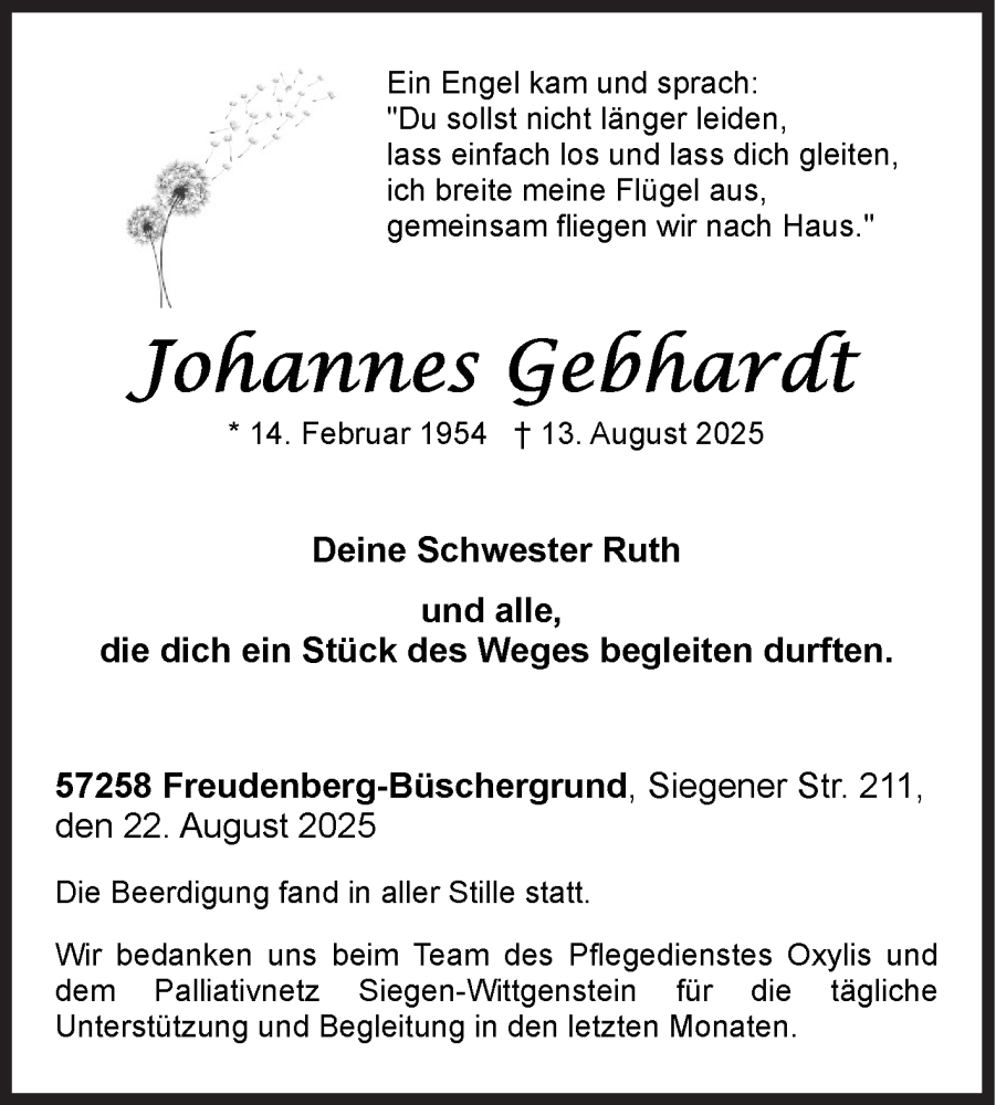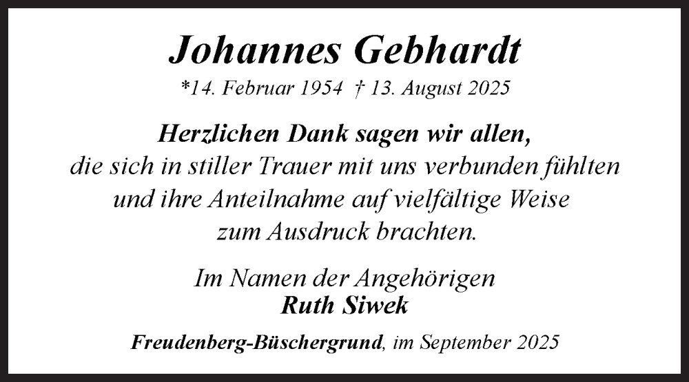 Hier finden Sie alle Traueranzeigen aus der Zeitung, die bisher für Johannes Gebhardt erschienen sind. Weitere Traueranzeigen, die in der Zeitung erscheinen, werden hier ebenfalls aufgelistet