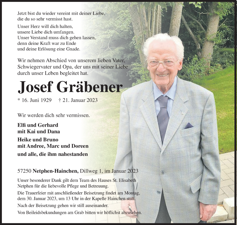 Hier finden Sie alle Traueranzeigen aus der Zeitung, die bisher für Josef Gräbener erschienen sind. Weitere Traueranzeigen, die in der Zeitung erscheinen, werden hier ebenfalls aufgelistet