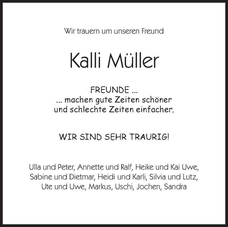 Hier finden Sie alle Traueranzeigen aus der Zeitung, die bisher für Kalli Müller erschienen sind. Weitere Traueranzeigen, die in der Zeitung erscheinen, werden hier ebenfalls aufgelistet