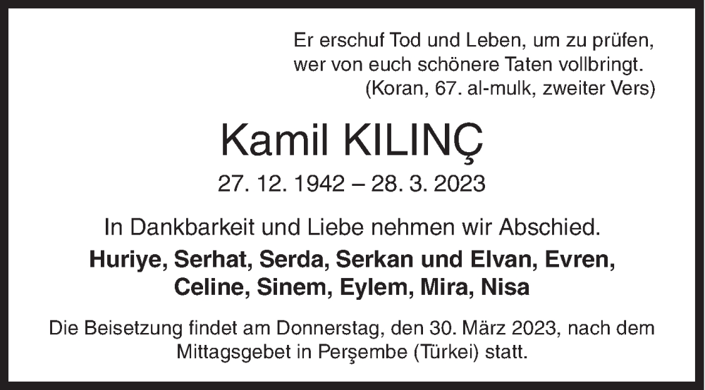 Hier finden Sie alle Traueranzeigen aus der Zeitung, die bisher für Kamil Kilinc erschienen sind. Weitere Traueranzeigen, die in der Zeitung erscheinen, werden hier ebenfalls aufgelistet