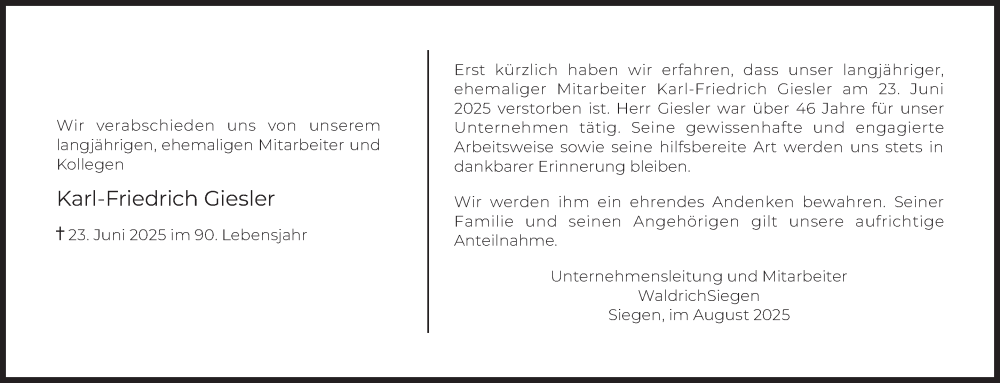 Hier finden Sie alle Traueranzeigen aus der Zeitung, die bisher für Karl-Friedrich Giesler erschienen sind. Weitere Traueranzeigen, die in der Zeitung erscheinen, werden hier ebenfalls aufgelistet