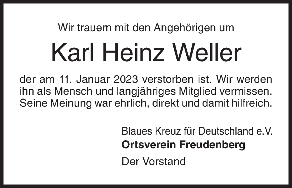 Hier finden Sie alle Traueranzeigen aus der Zeitung, die bisher für Karl Heinz Weller erschienen sind. Weitere Traueranzeigen, die in der Zeitung erscheinen, werden hier ebenfalls aufgelistet