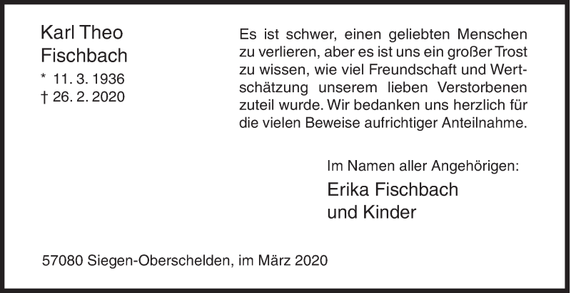 Hier finden Sie alle Traueranzeigen aus der Zeitung, die bisher für Karl Theo Fischbach erschienen sind. Weitere Traueranzeigen, die in der Zeitung erscheinen, werden hier ebenfalls aufgelistet