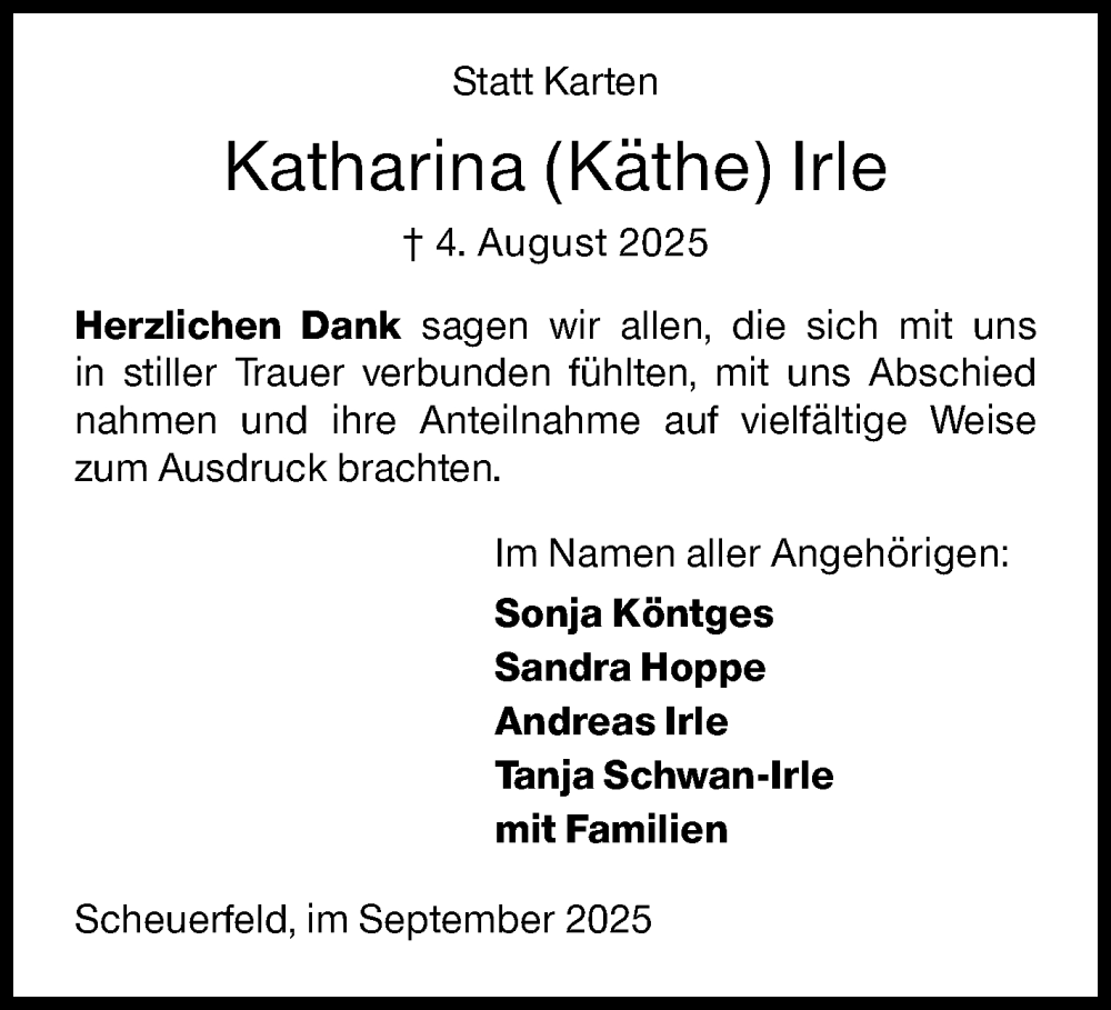 Hier finden Sie alle Traueranzeigen aus der Zeitung, die bisher für Katharina Irle erschienen sind. Weitere Traueranzeigen, die in der Zeitung erscheinen, werden hier ebenfalls aufgelistet