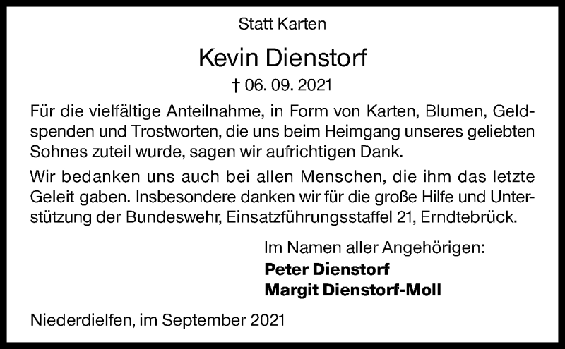 Hier finden Sie alle Traueranzeigen aus der Zeitung, die bisher für Kevin Dienstorf erschienen sind. Weitere Traueranzeigen, die in der Zeitung erscheinen, werden hier ebenfalls aufgelistet