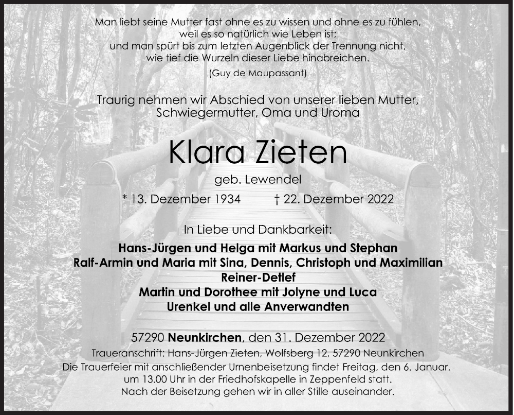 Hier finden Sie alle Traueranzeigen aus der Zeitung, die bisher für Klara Zieten erschienen sind. Weitere Traueranzeigen, die in der Zeitung erscheinen, werden hier ebenfalls aufgelistet