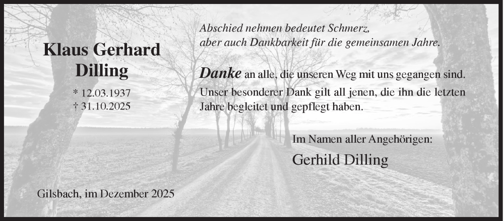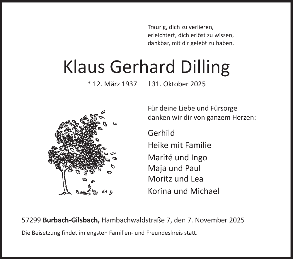 Hier finden Sie alle Traueranzeigen aus der Zeitung, die bisher für Klaus Gerhard Dilling erschienen sind. Weitere Traueranzeigen, die in der Zeitung erscheinen, werden hier ebenfalls aufgelistet