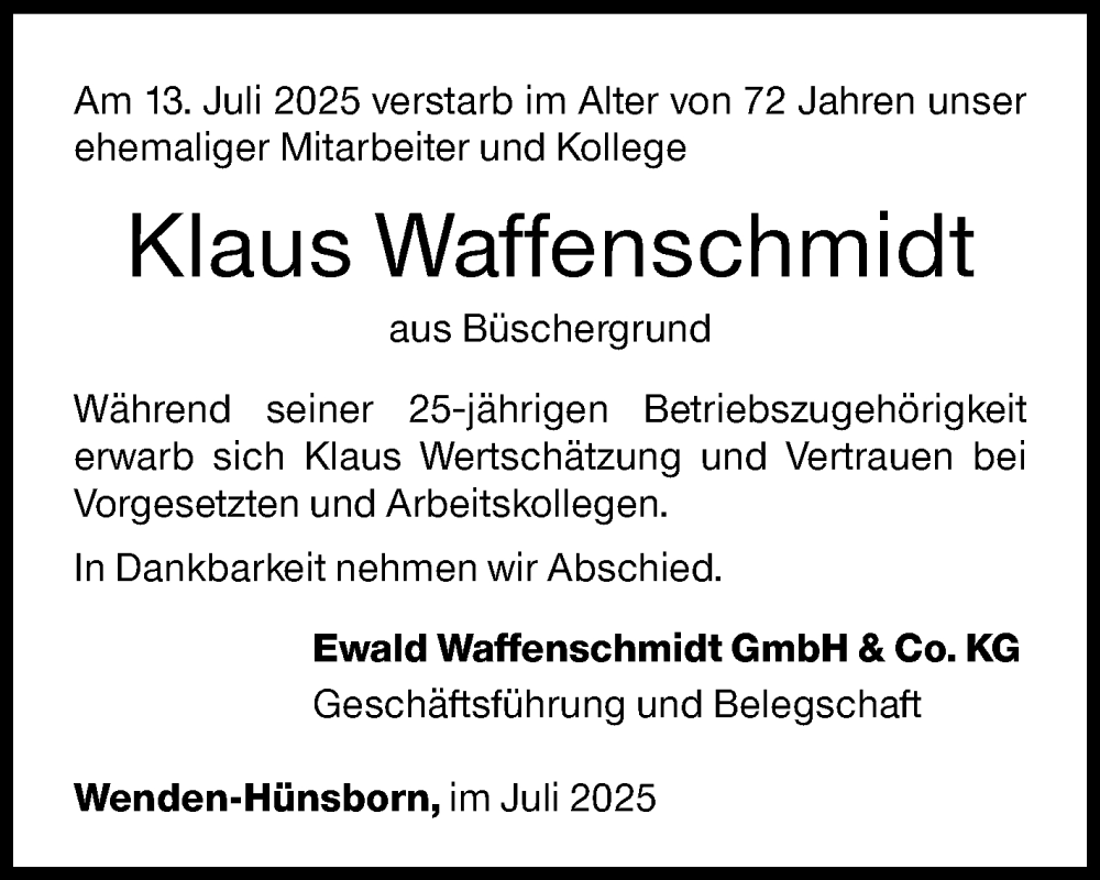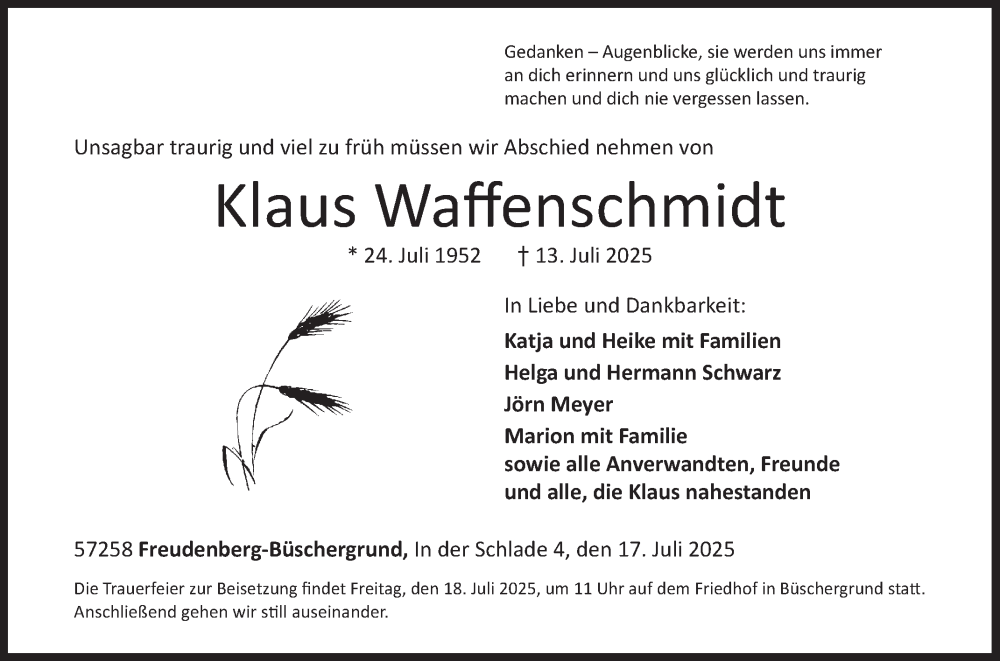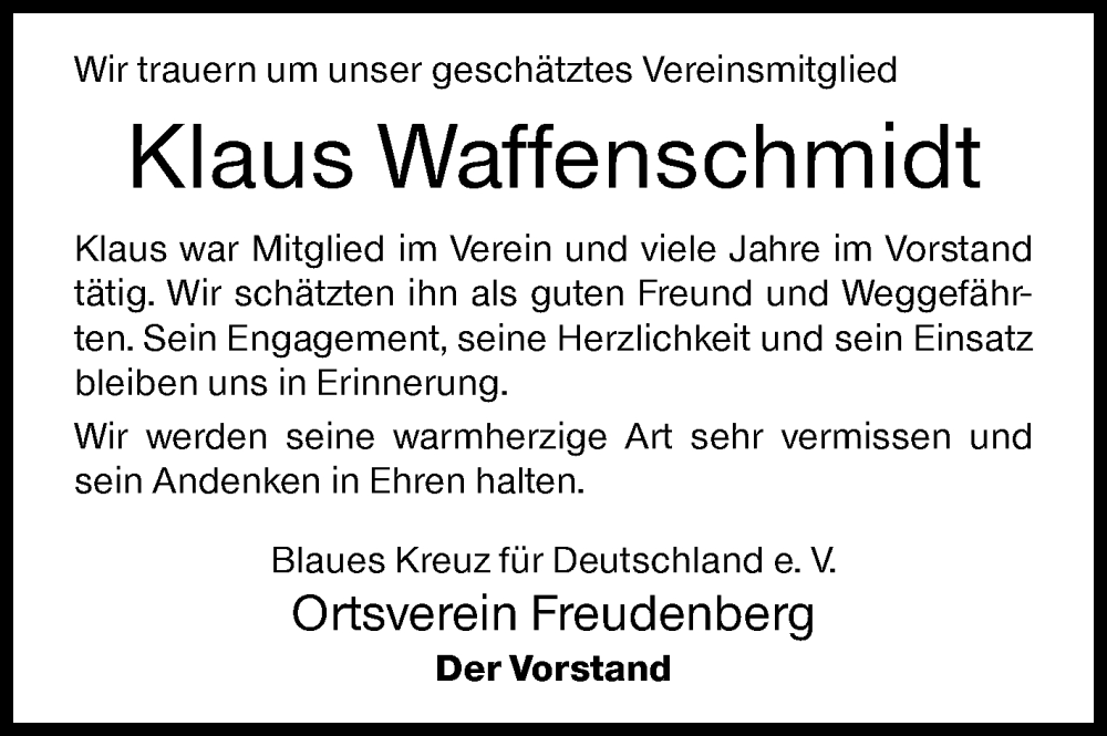 Hier finden Sie alle Traueranzeigen aus der Zeitung, die bisher für Klaus Waffenschmidt erschienen sind. Weitere Traueranzeigen, die in der Zeitung erscheinen, werden hier ebenfalls aufgelistet
