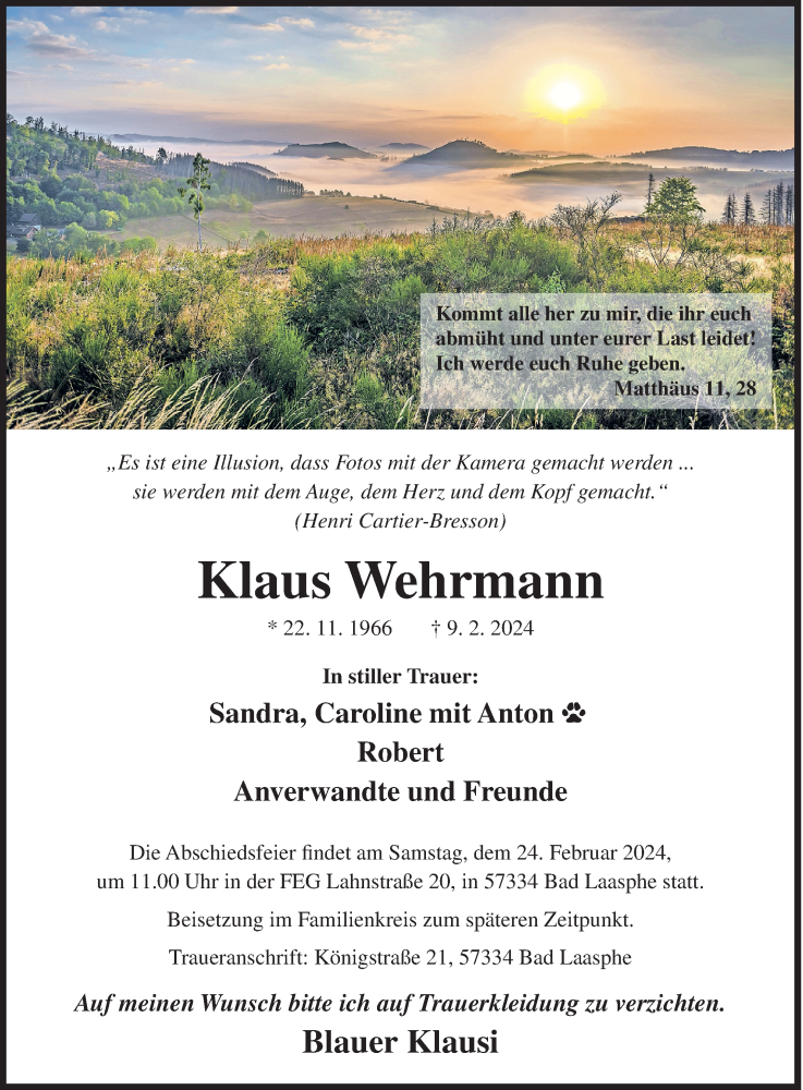 Hier finden Sie alle Traueranzeigen aus der Zeitung, die bisher für Klaus Wehrmann erschienen sind. Weitere Traueranzeigen, die in der Zeitung erscheinen, werden hier ebenfalls aufgelistet