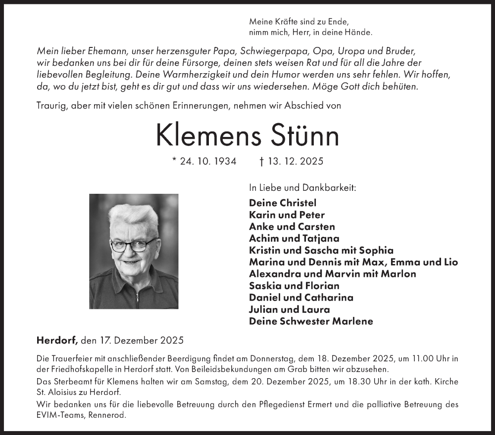 Hier finden Sie alle Traueranzeigen aus der Zeitung, die bisher für Klemens Stünn erschienen sind. Weitere Traueranzeigen, die in der Zeitung erscheinen, werden hier ebenfalls aufgelistet