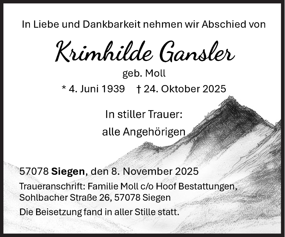 Hier finden Sie alle Traueranzeigen aus der Zeitung, die bisher für Krimhilde Gansler erschienen sind. Weitere Traueranzeigen, die in der Zeitung erscheinen, werden hier ebenfalls aufgelistet