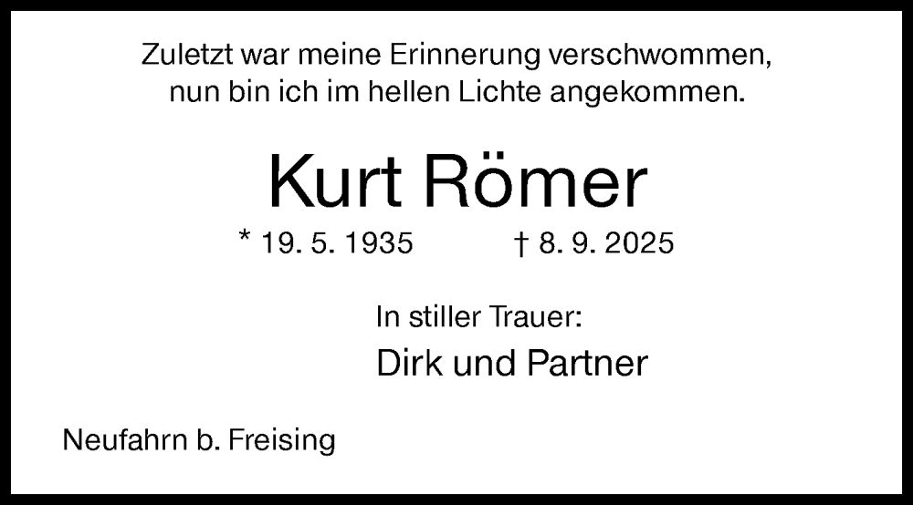 Hier finden Sie alle Traueranzeigen aus der Zeitung, die bisher für Kurt Römer erschienen sind. Weitere Traueranzeigen, die in der Zeitung erscheinen, werden hier ebenfalls aufgelistet