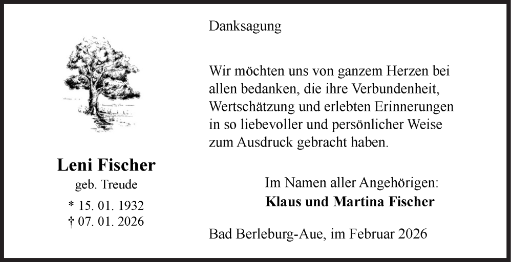 Hier finden Sie alle Traueranzeigen aus der Zeitung, die bisher für Leni Fischer erschienen sind. Weitere Traueranzeigen, die in der Zeitung erscheinen, werden hier ebenfalls aufgelistet