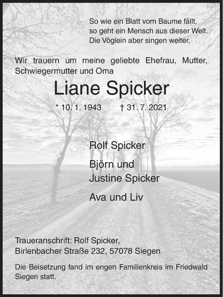 Hier finden Sie alle Traueranzeigen aus der Zeitung, die bisher für Liane Spicker erschienen sind. Weitere Traueranzeigen, die in der Zeitung erscheinen, werden hier ebenfalls aufgelistet