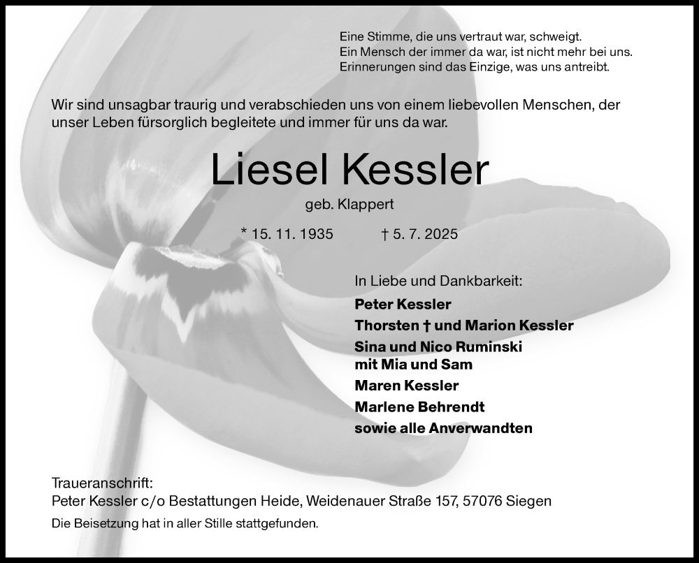 Hier finden Sie alle Traueranzeigen aus der Zeitung, die bisher für Liesel Kessler erschienen sind. Weitere Traueranzeigen, die in der Zeitung erscheinen, werden hier ebenfalls aufgelistet