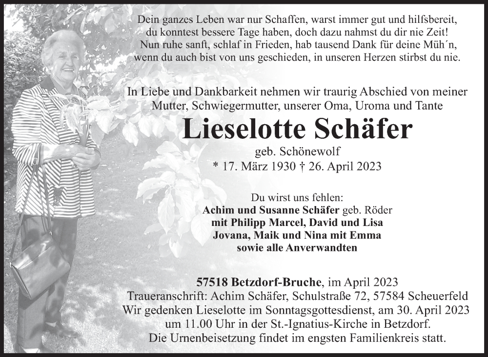 Hier finden Sie alle Traueranzeigen aus der Zeitung, die bisher für Lieselotte Schäfer erschienen sind. Weitere Traueranzeigen, die in der Zeitung erscheinen, werden hier ebenfalls aufgelistet