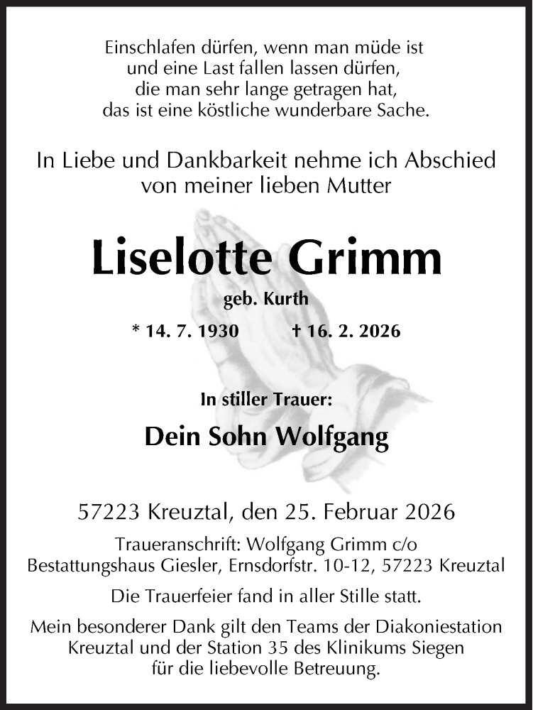 Hier finden Sie alle Traueranzeigen aus der Zeitung, die bisher für Liselotte Grimm erschienen sind. Weitere Traueranzeigen, die in der Zeitung erscheinen, werden hier ebenfalls aufgelistet