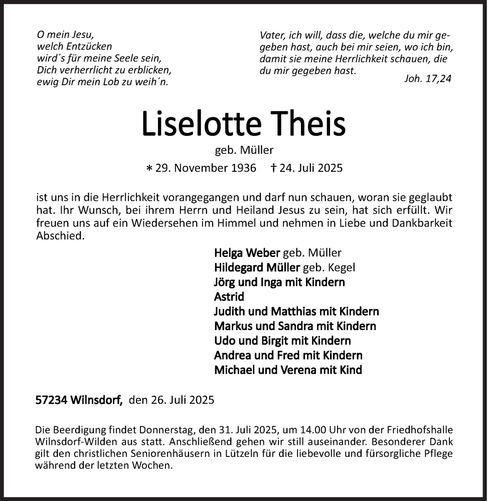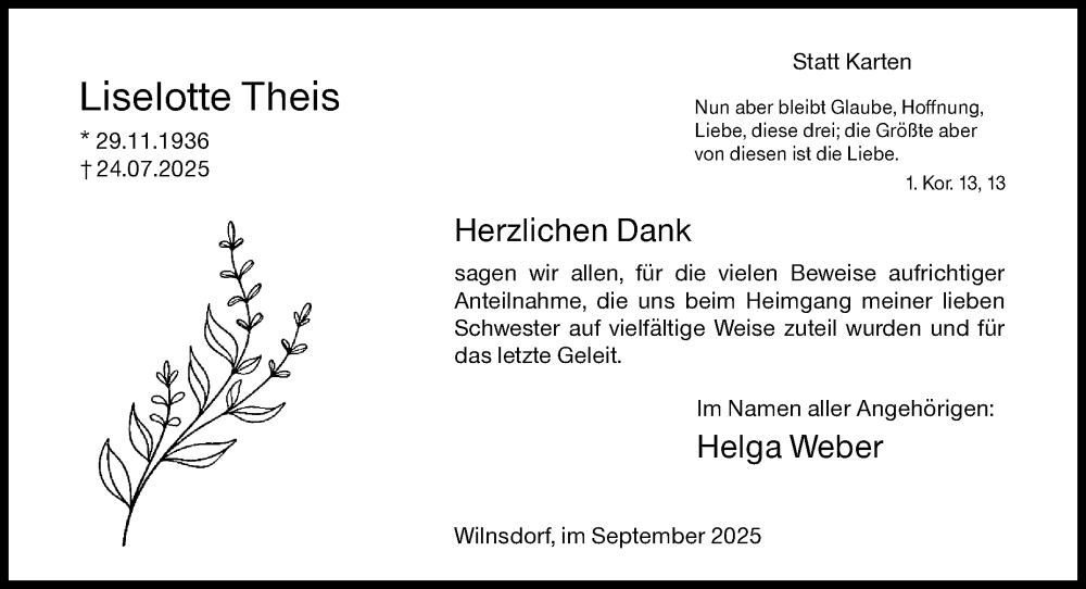 Hier finden Sie alle Traueranzeigen aus der Zeitung, die bisher für Liselotte Theis erschienen sind. Weitere Traueranzeigen, die in der Zeitung erscheinen, werden hier ebenfalls aufgelistet