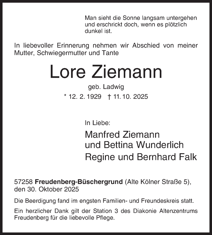 Hier finden Sie alle Traueranzeigen aus der Zeitung, die bisher für Lore Ziemann erschienen sind. Weitere Traueranzeigen, die in der Zeitung erscheinen, werden hier ebenfalls aufgelistet