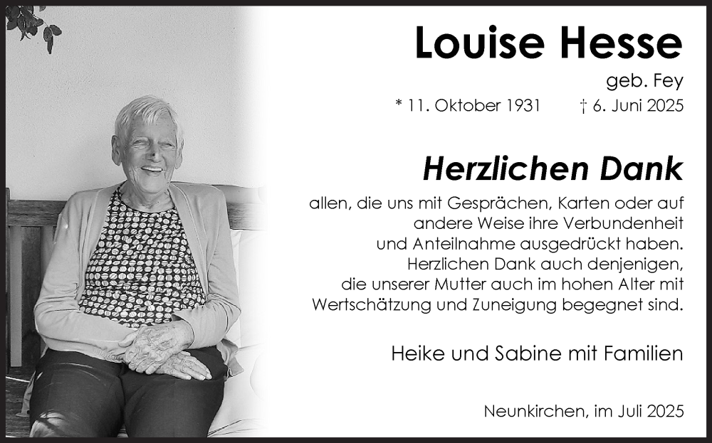 Hier finden Sie alle Traueranzeigen aus der Zeitung, die bisher für Louise Hesse erschienen sind. Weitere Traueranzeigen, die in der Zeitung erscheinen, werden hier ebenfalls aufgelistet