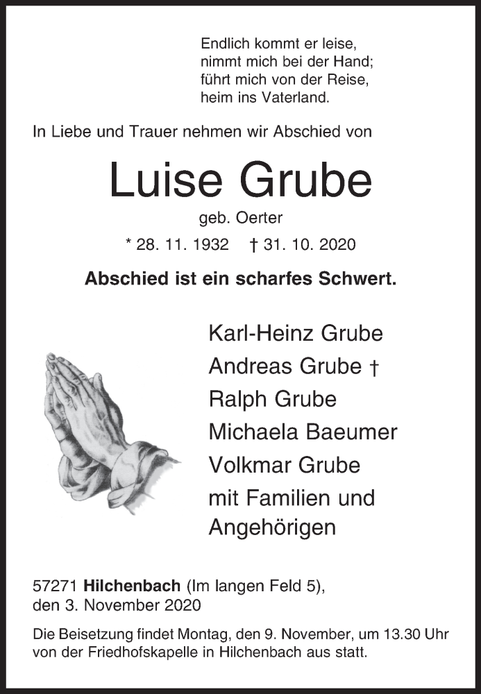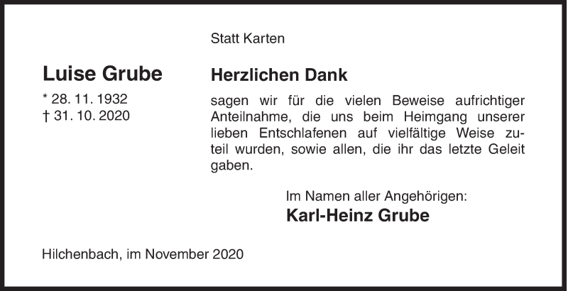 Hier finden Sie alle Traueranzeigen aus der Zeitung, die bisher für Luise Grube erschienen sind. Weitere Traueranzeigen, die in der Zeitung erscheinen, werden hier ebenfalls aufgelistet