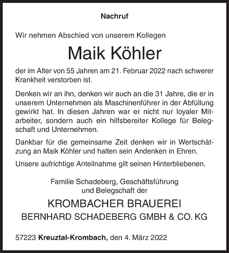 Hier finden Sie alle Traueranzeigen aus der Zeitung, die bisher für Maik Köhler erschienen sind. Weitere Traueranzeigen, die in der Zeitung erscheinen, werden hier ebenfalls aufgelistet