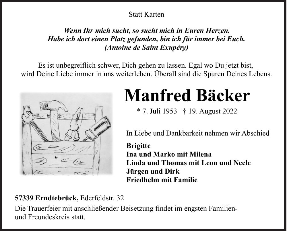 Hier finden Sie alle Traueranzeigen aus der Zeitung, die bisher für Manfred Bäcker erschienen sind. Weitere Traueranzeigen, die in der Zeitung erscheinen, werden hier ebenfalls aufgelistet