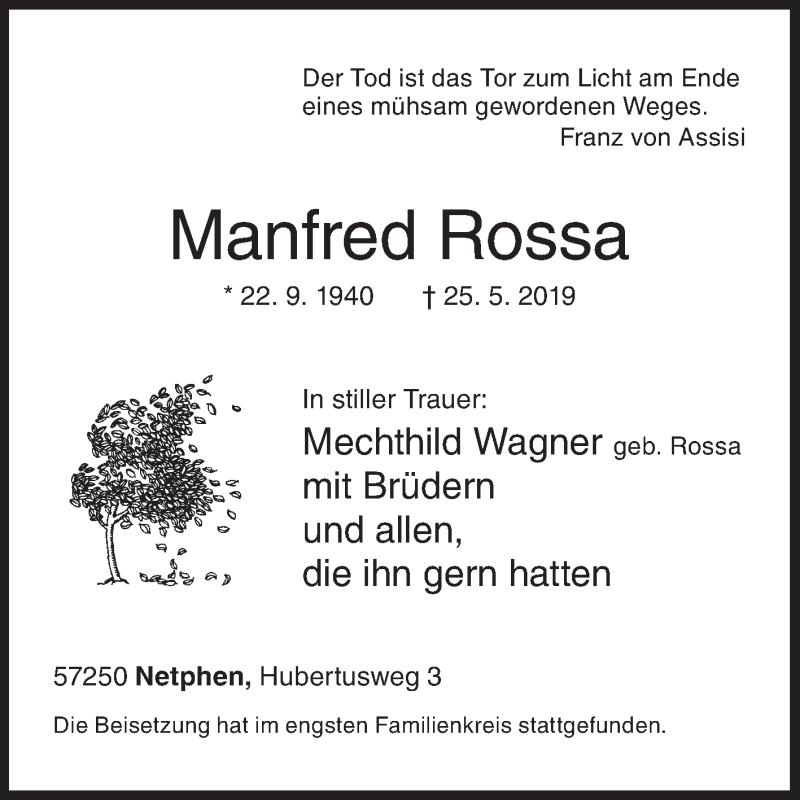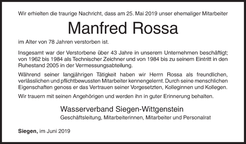 Hier finden Sie alle Traueranzeigen aus der Zeitung, die bisher für Manfred Rossa erschienen sind. Weitere Traueranzeigen, die in der Zeitung erscheinen, werden hier ebenfalls aufgelistet