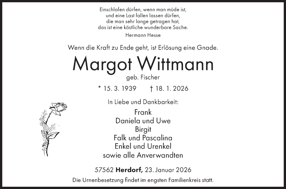 Hier finden Sie alle Traueranzeigen aus der Zeitung, die bisher für Margot Wittmann erschienen sind. Weitere Traueranzeigen, die in der Zeitung erscheinen, werden hier ebenfalls aufgelistet