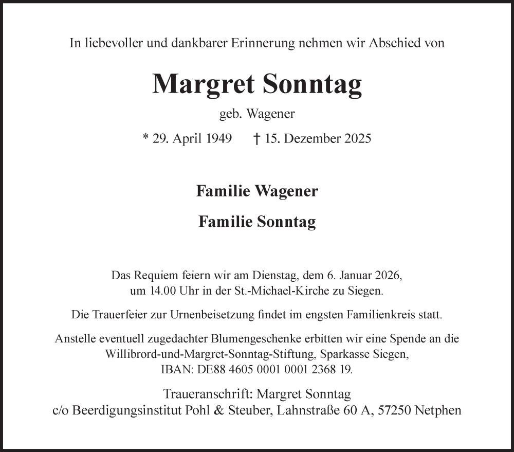 Hier finden Sie alle Traueranzeigen aus der Zeitung, die bisher für Margret Sonntag erschienen sind. Weitere Traueranzeigen, die in der Zeitung erscheinen, werden hier ebenfalls aufgelistet