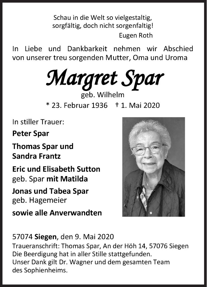 Hier finden Sie alle Traueranzeigen aus der Zeitung, die bisher für Margret Spar erschienen sind. Weitere Traueranzeigen, die in der Zeitung erscheinen, werden hier ebenfalls aufgelistet