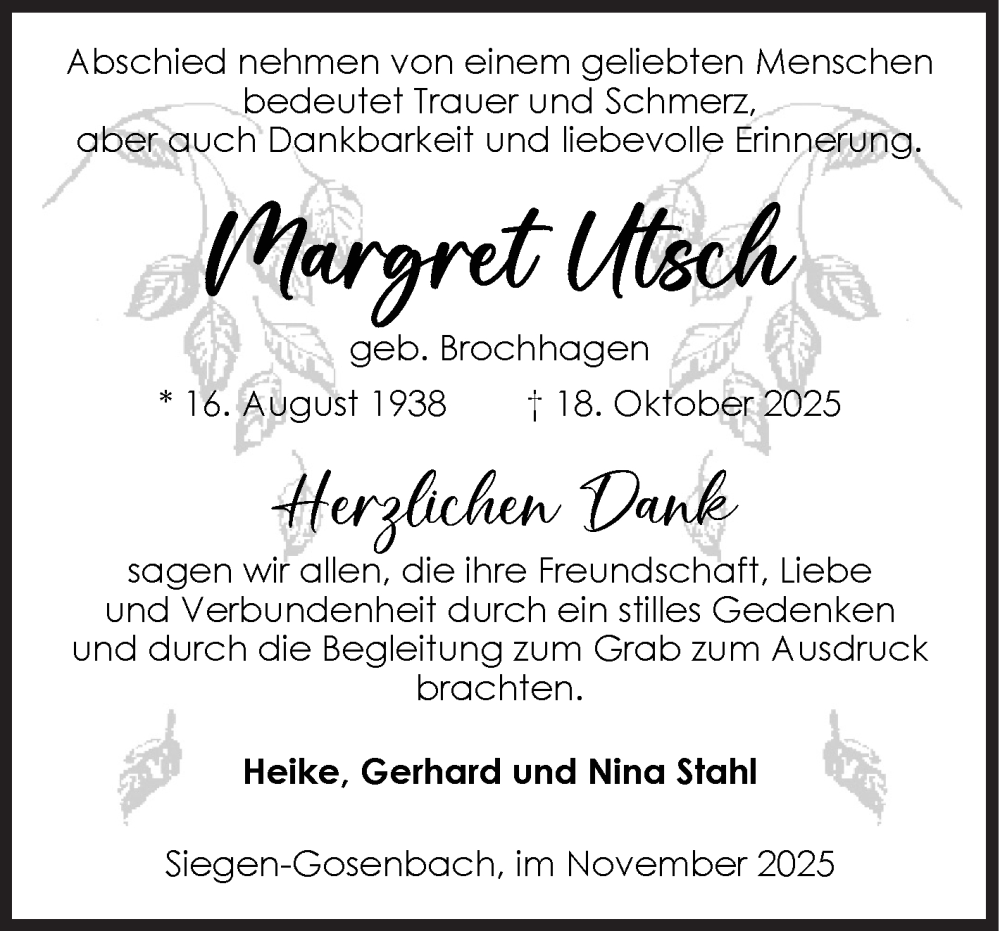 Hier finden Sie alle Traueranzeigen aus der Zeitung, die bisher für Margret Utsch erschienen sind. Weitere Traueranzeigen, die in der Zeitung erscheinen, werden hier ebenfalls aufgelistet