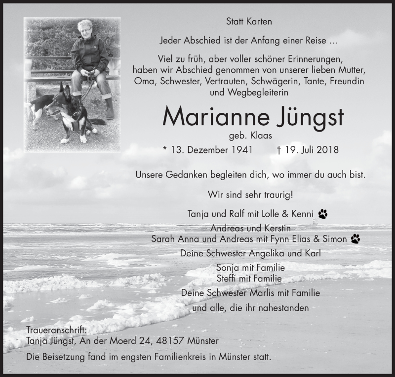 Hier finden Sie alle Traueranzeigen aus der Zeitung, die bisher für Marianne Jüngst erschienen sind. Weitere Traueranzeigen, die in der Zeitung erscheinen, werden hier ebenfalls aufgelistet