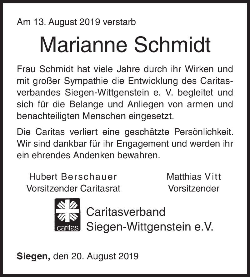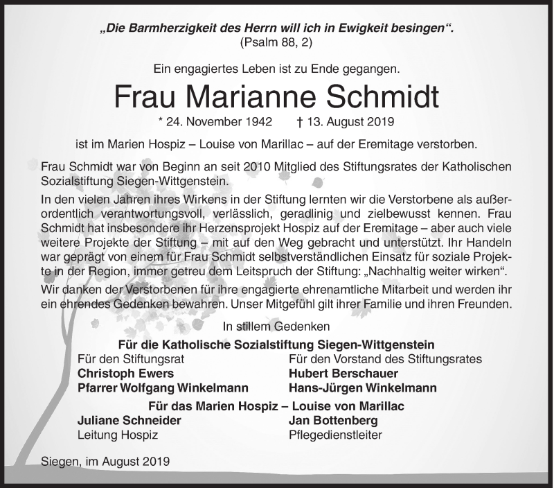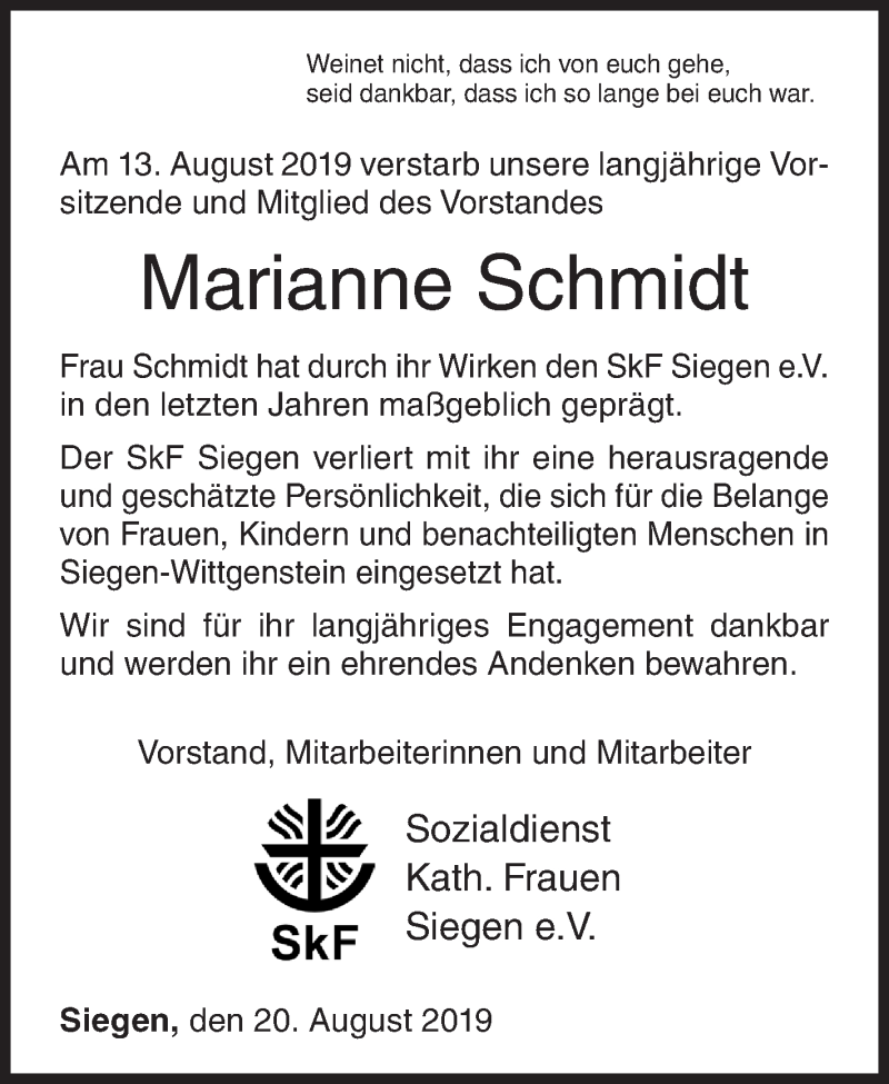 Hier finden Sie alle Traueranzeigen aus der Zeitung, die bisher für Marianne Schmidt erschienen sind. Weitere Traueranzeigen, die in der Zeitung erscheinen, werden hier ebenfalls aufgelistet
