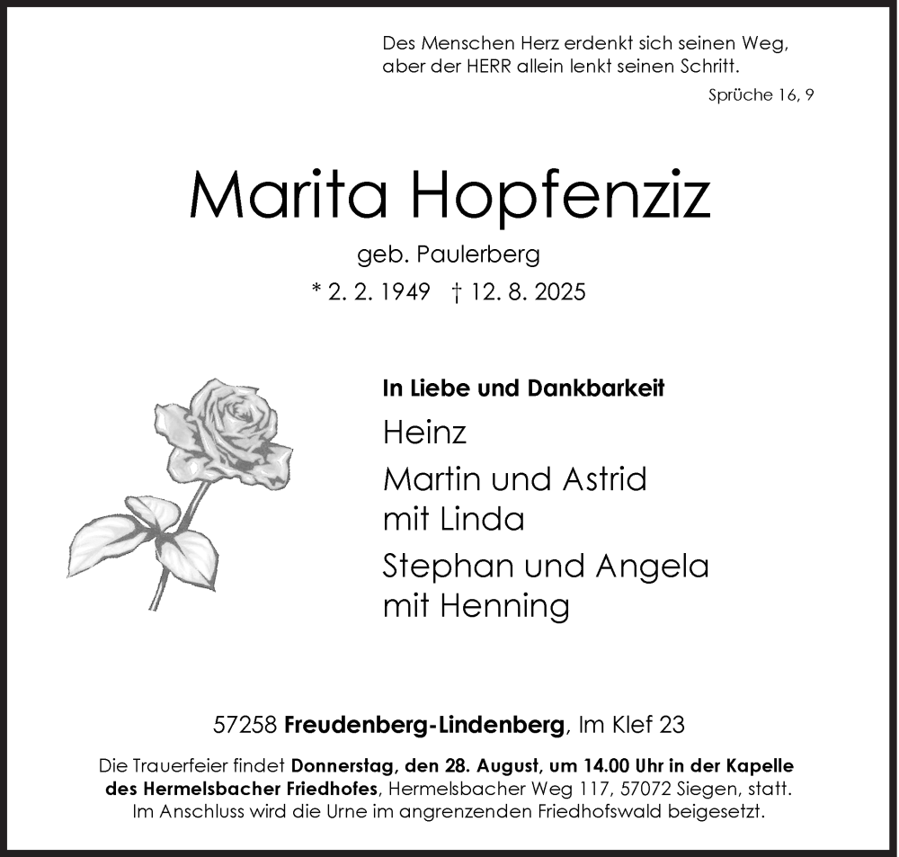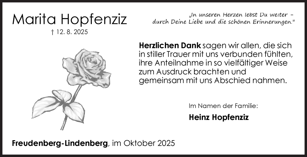 Hier finden Sie alle Traueranzeigen aus der Zeitung, die bisher für Marita Hopfenziz erschienen sind. Weitere Traueranzeigen, die in der Zeitung erscheinen, werden hier ebenfalls aufgelistet