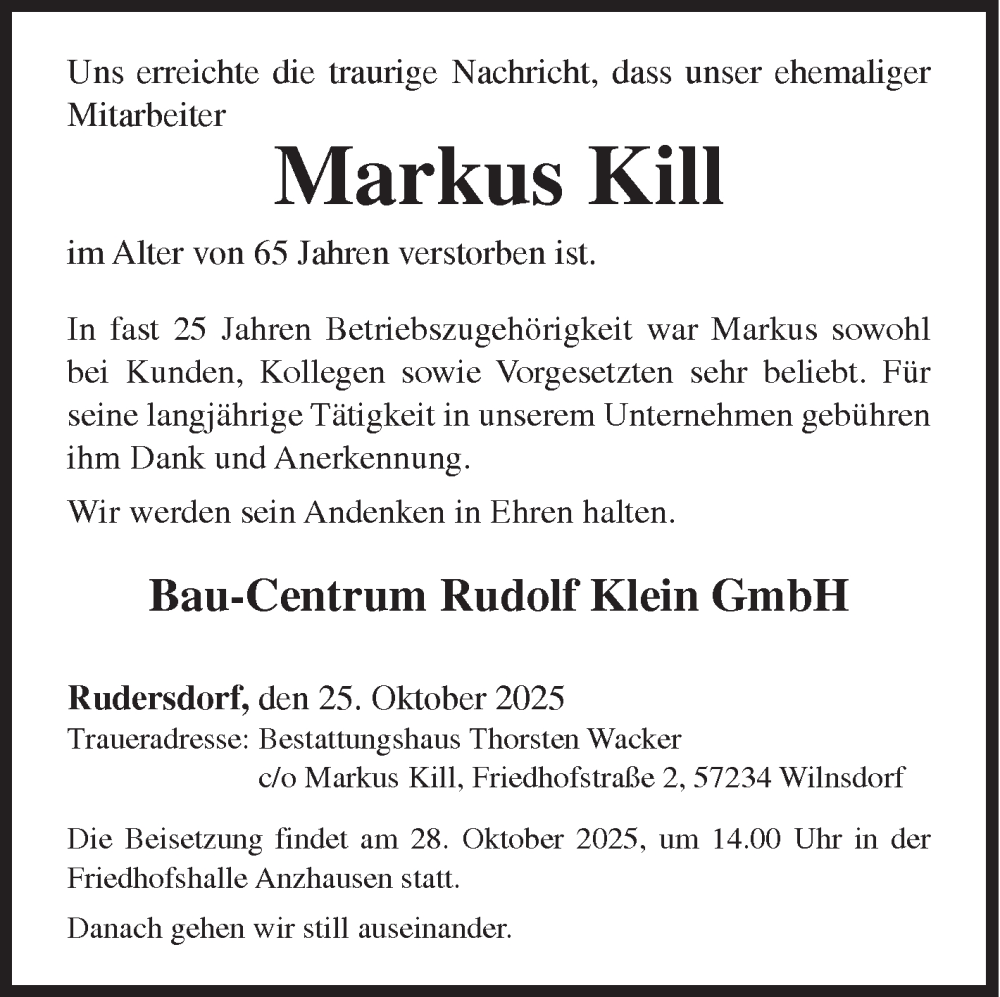 Hier finden Sie alle Traueranzeigen aus der Zeitung, die bisher für Markus Kill erschienen sind. Weitere Traueranzeigen, die in der Zeitung erscheinen, werden hier ebenfalls aufgelistet
