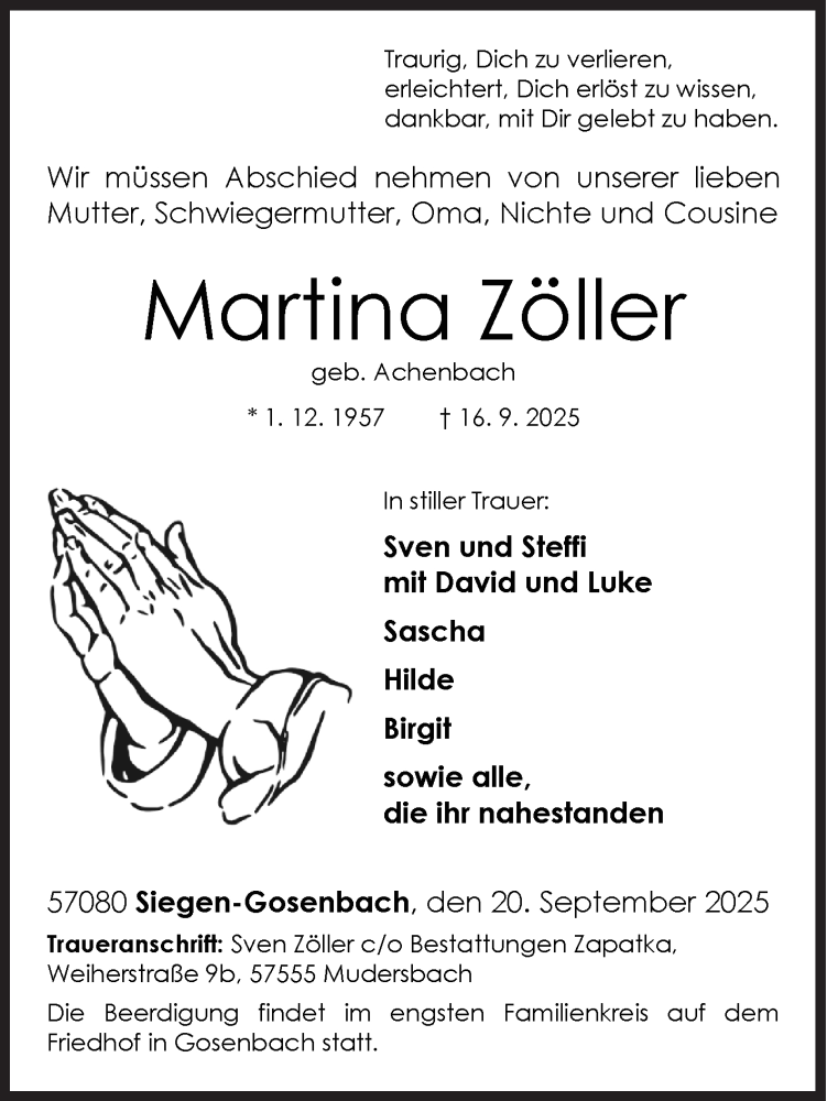 Hier finden Sie alle Traueranzeigen aus der Zeitung, die bisher für Martina Zöller erschienen sind. Weitere Traueranzeigen, die in der Zeitung erscheinen, werden hier ebenfalls aufgelistet