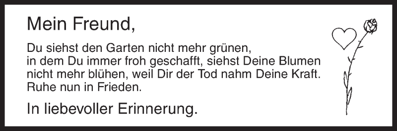 Hier finden Sie alle Traueranzeigen aus der Zeitung, die bisher für Mein Freund erschienen sind. Weitere Traueranzeigen, die in der Zeitung erscheinen, werden hier ebenfalls aufgelistet