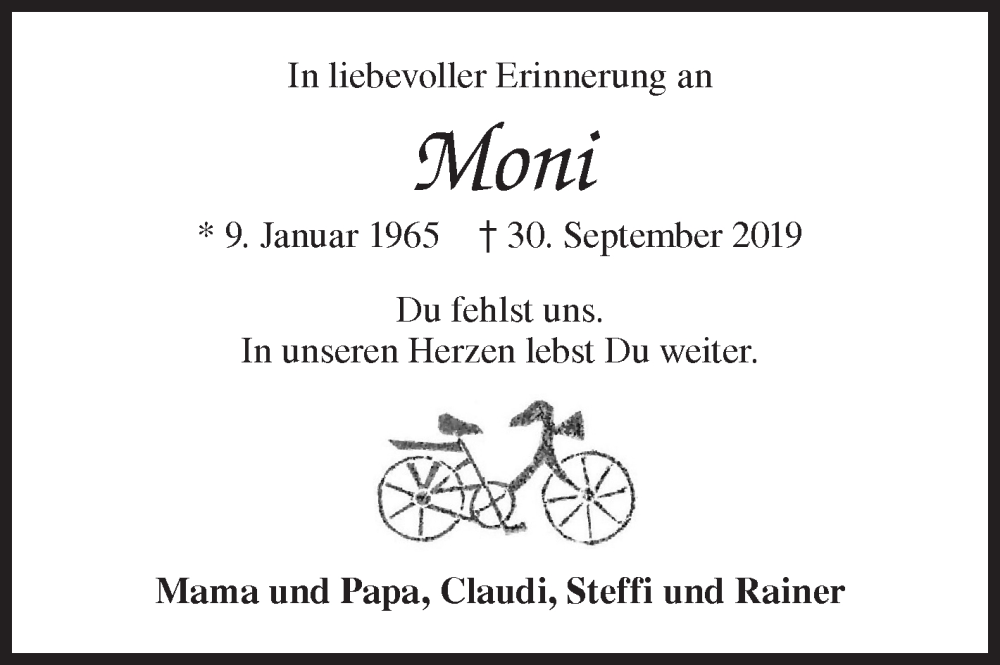 Hier finden Sie alle Traueranzeigen aus der Zeitung, die bisher für Moni erschienen sind. Weitere Traueranzeigen, die in der Zeitung erscheinen, werden hier ebenfalls aufgelistet