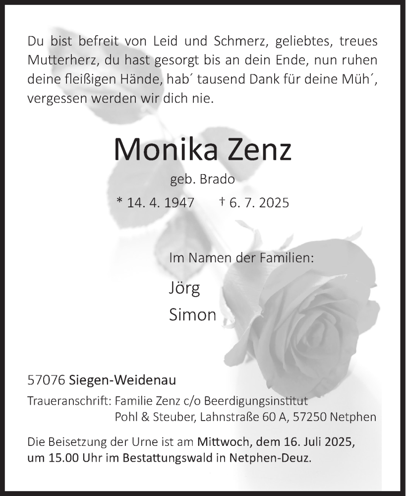 Hier finden Sie alle Traueranzeigen aus der Zeitung, die bisher für Monika Zenz erschienen sind. Weitere Traueranzeigen, die in der Zeitung erscheinen, werden hier ebenfalls aufgelistet