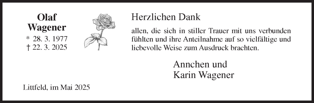 Hier finden Sie alle Traueranzeigen aus der Zeitung, die bisher für Olaf Wagener erschienen sind. Weitere Traueranzeigen, die in der Zeitung erscheinen, werden hier ebenfalls aufgelistet
