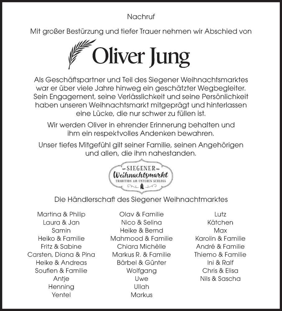 Hier finden Sie alle Traueranzeigen aus der Zeitung, die bisher für Oliver Jung erschienen sind. Weitere Traueranzeigen, die in der Zeitung erscheinen, werden hier ebenfalls aufgelistet