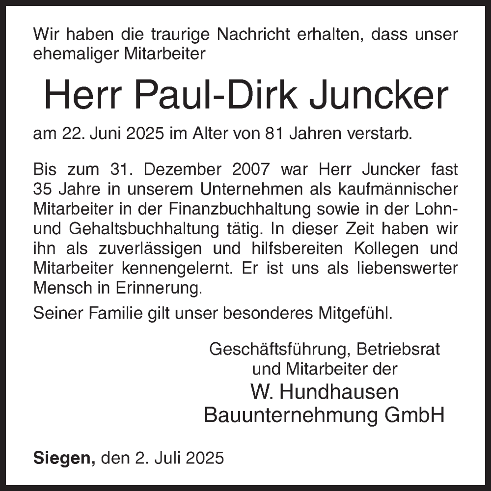 Hier finden Sie alle Traueranzeigen aus der Zeitung, die bisher für Paul-Dirk Juncker erschienen sind. Weitere Traueranzeigen, die in der Zeitung erscheinen, werden hier ebenfalls aufgelistet